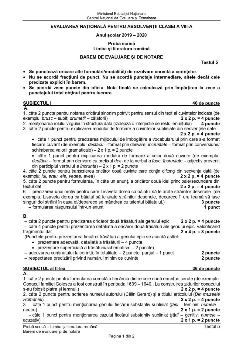 Luni a început evaluarea națională cu proba la limba și literatura română și a fost extrasă varianta 5. Elevii sunt așteptați la centrele de examinare începând cu ora 7 baremul de corectare este și el important și vom publica și rezolvarea probei scrise de la limba română. Vezi subiectele la limba si literatura romana subiectul i a avut 6 subpuncte, unde elevii au fost pusi sa rezolve diverse probleme. Ai imagini sau informaţii care ar putea deveni o ştire? Baremul pentru evaluare națională 2020, la limba și literatura română, a fost publicat!